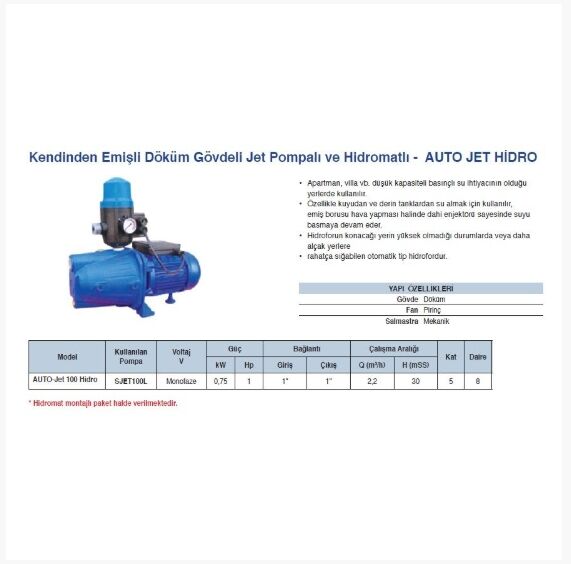 Grandfar AUTO-Jet 100 Hidro 1Hp 220V Jet Pompalı ve Hidromatlı Kendinden Emişli Döküm Gövdeli Paket Hidrofor