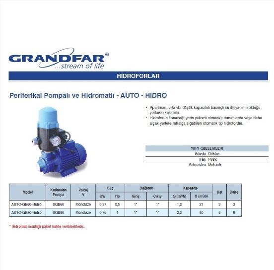 Grandfar AUTO-QB60-Hidro 0,50 Hp 220V Preferikal Pompalı ve Hidromatlı Paket Hidrofor