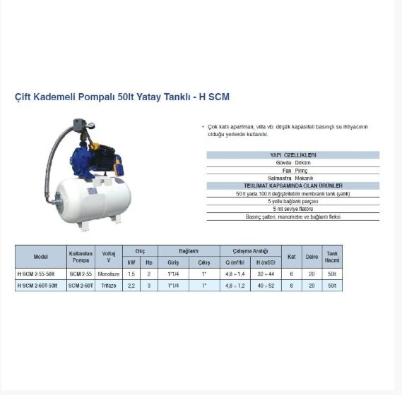 Grandfar H SCM 2-55-50lt 2Hp 220V Çift Kademeli Pompalı ve 50 Litre Yatay Tanklı Döküm Gövdeli Paket Hidrofor