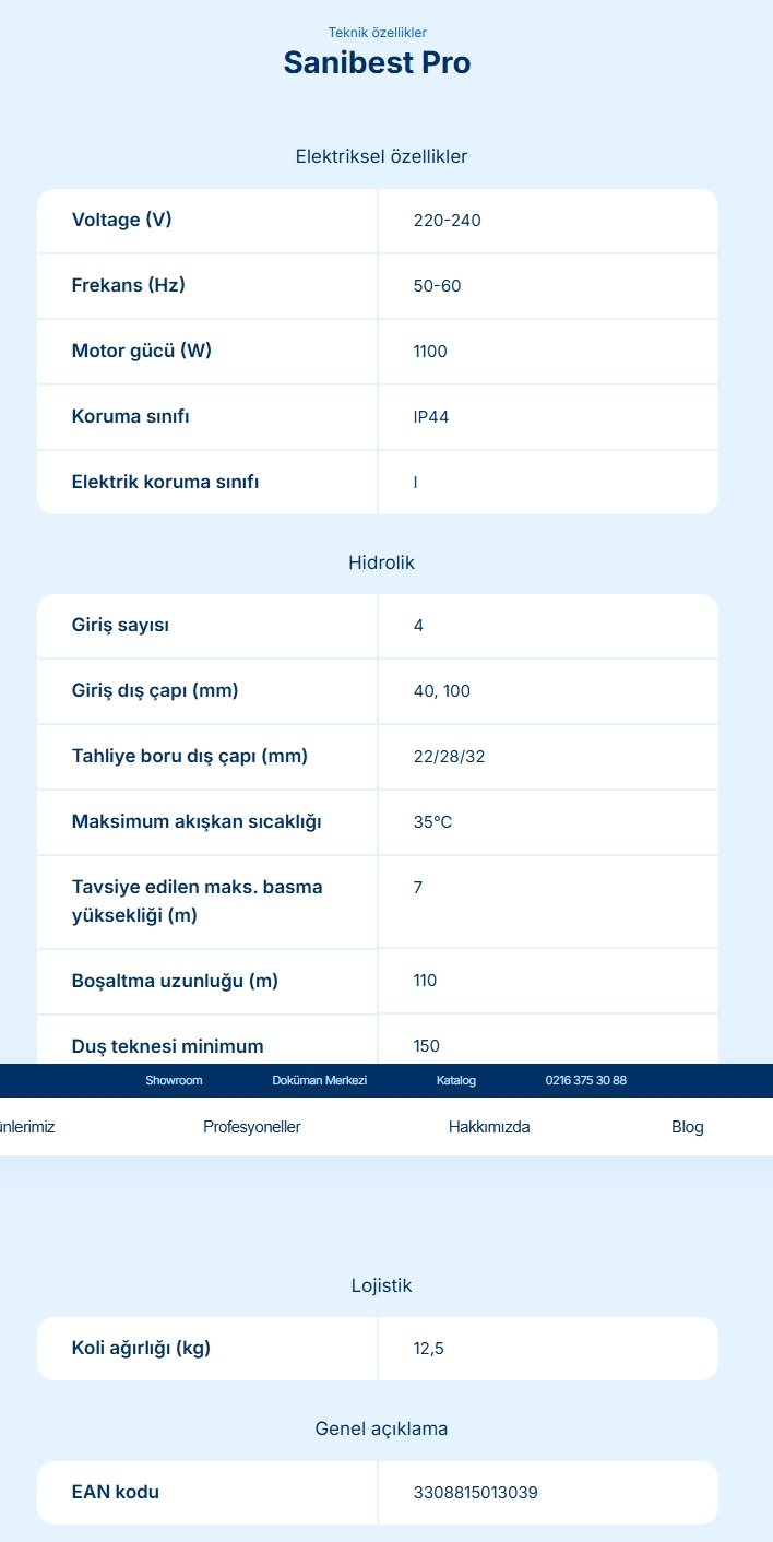 Sanibest Pro yüksek performanslı bir WC öğütücüdür.Kanalizasyon seviyesinin altında kalan bodrum katlardaki iş yerlerine tuvalet kurabilmenizi sağlar. ProX K2 parçalayıcı bıçak*ile donatılmış olan cihaz yoğun kullanım için uygundur.Otel, yazlık, AVM, restaurant, bar, cafe ve benzeri halka açık yerlerde kolaylıkla uygulanabilir.Herhangi bir arkadan çıkışlı klozete monte edilebilir.Sanibest Pro foseptik sularını maksimum dikey 7 veya yatay 110 metre'ye kadar tahliye edebilmektedir.*ProX K2 parçalayıcı bıçak: Organik atık ve tuvalet kağıdını parçalar. Yanlışlıkla atılan bayan ped veya bezlere karşı yüksek performans sağlamaktadır.Sanibest Pro SFA Grubunun Fransa'daki Brégy (FR-60) fabrikasında üretilmektedir. “Origine France Garantie” sertifikasına sahiptir.